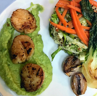 my version -- quinoa with mixed green, jicama, sautéed carrots, chard bok choy dressed with thai basil salsa verde. seared scallops served over pea purée...