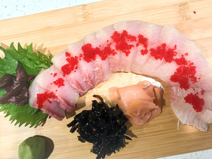 sashimi -- hamachi, yellow tail, salmon, ama-ebi.