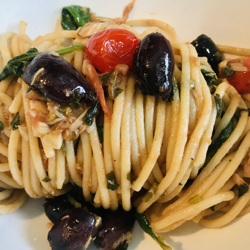 my version -- with garlic, anchovy, spinach, kalamata olives, parsley, cherry tomatoes, and peperoncino...